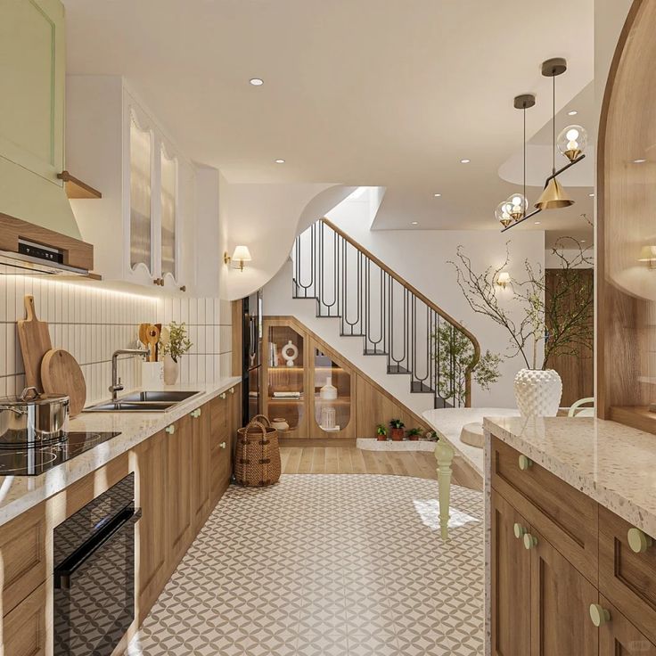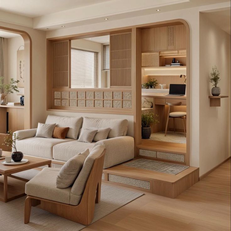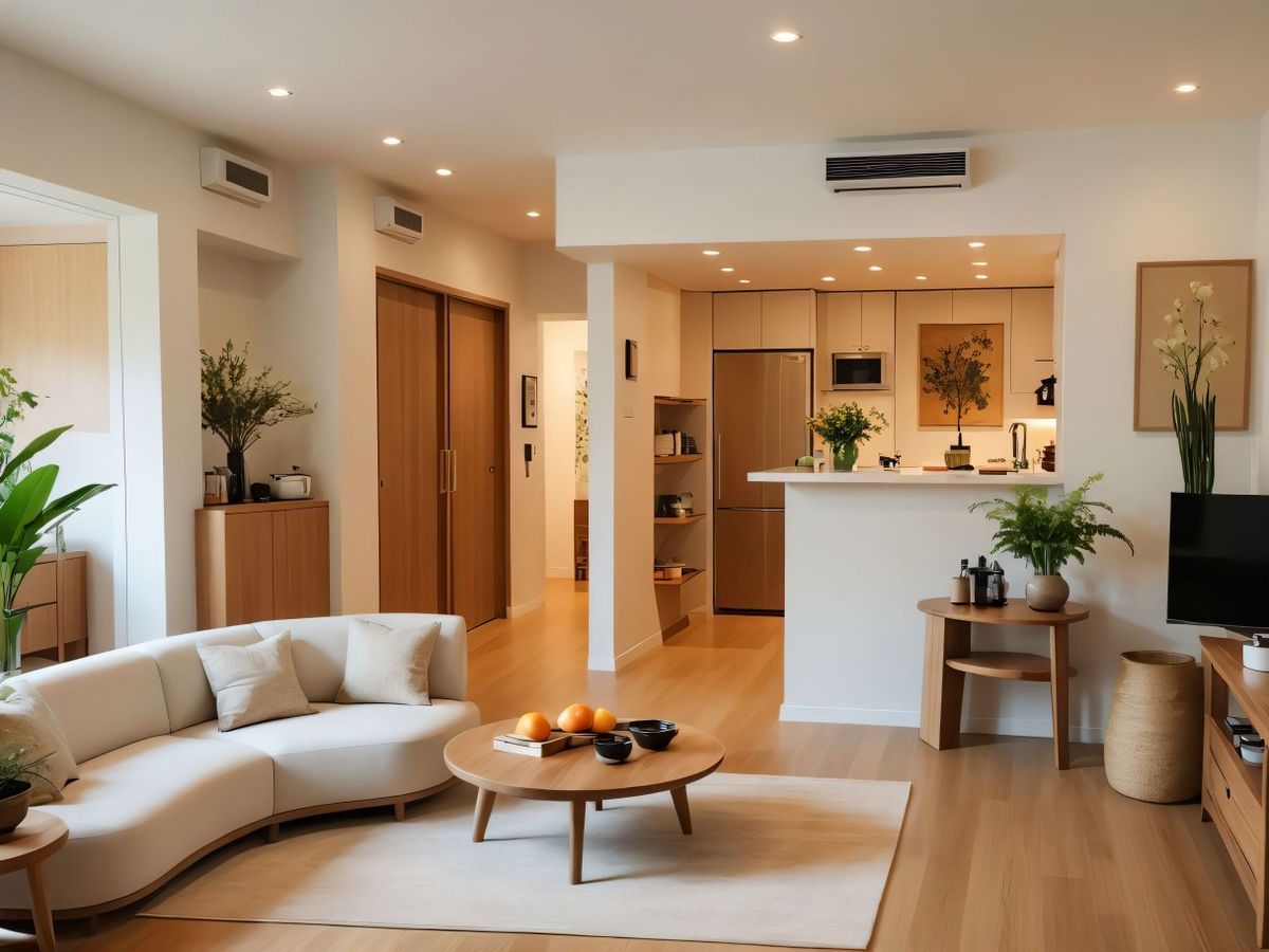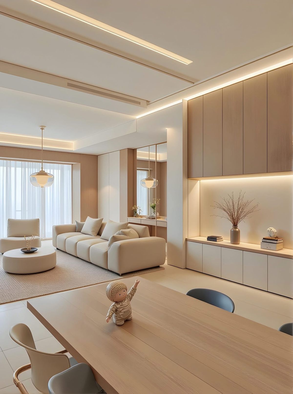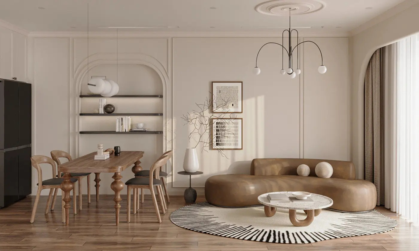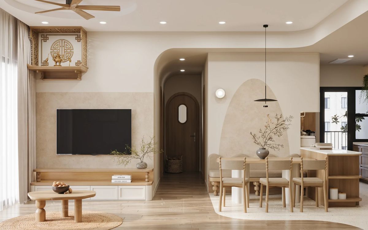 Sự kết hợp hoàn hảo giữa nét trầm mặc Á Đông và ánh sáng rực rỡ Bắc Âu. Tone màu chủ đạo chuyển sang dải màu ấm: trắng ngà, màu đất nung, màu gỗ tự nhiên. Gỗ Sồi (Oak) và Tần Bì (Ash) có vân gỗ sáng phủ khắp sàn nhà, mặt bàn, cánh tủ. Các góc cạnh sắc nhọn được bo tròn mềm mại. Chiều cao đồ nội thất hạ thấp sát mặt đất theo văn hóa trà đạo Nhật Bản. Giường ngủ bệt không chân. Ghế sofa lùn. Khoảng không gian từ đồ vật lên trần nhà giãn rộng tối đa. Vật liệu thô mộc xuất hiện: rây mây mắt cáo, vải linen thô, gốm sứ thủ công. Ánh sáng vàng ấm 3000K tỏa ra từ đèn lồng giấy bồi. Cây xanh lá nhỏ trồng trong chậu đất nung thanh lọc không khí. Tổng thể mang lại tác dụng chữa lành tâm lý (healing) sau giờ làm việc căng thẳng. Không gian gọn gàng nhưng tỏa ra sự ấm áp, thân thuộc, cực kỳ an toàn cho trẻ em chập chững biết đi.