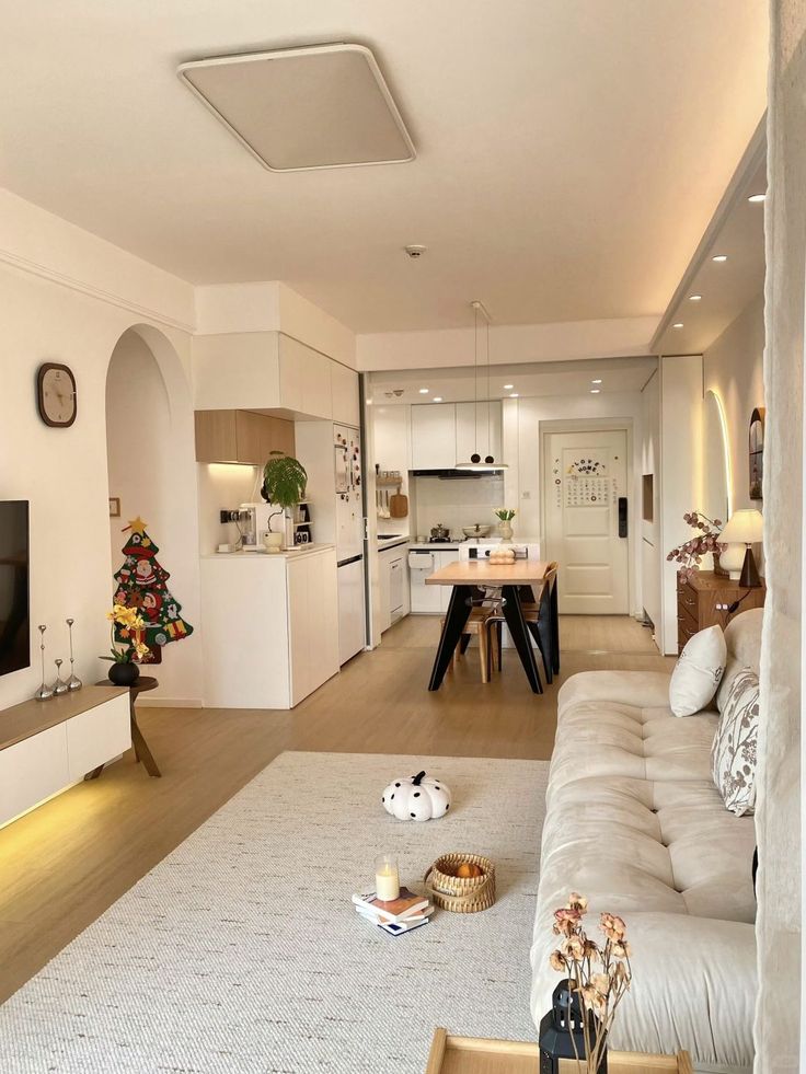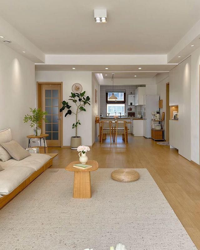 - Sự đồng nhất mặt sàn: Lát một loại sàn gỗ duy nhất xuyên suốt phòng khách và bếp. Mạch ron gỗ chạy dọc theo chiều dài căn hộ kéo giãn kích thước thị giác.