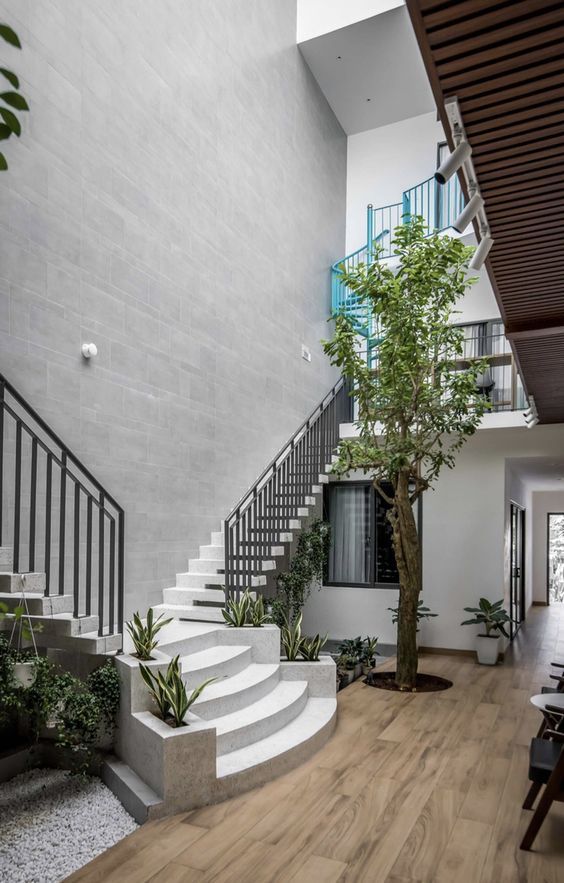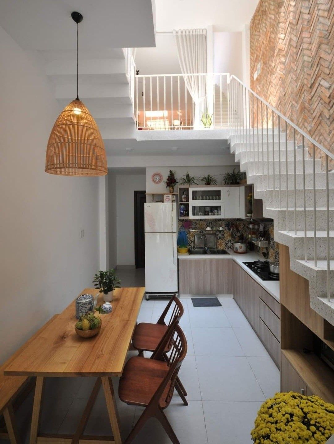 Cầu thang trong nhà ống 5m thường được bố trí ở giữa nhà hoặc ép sát tường. Cách xử lý vách ngăn cầu thang quyết định 50% vẻ đẹp phòng khách.